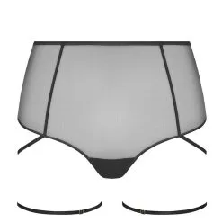 Cette culotte taille haute habille le ventre et les hanches d’une dentelle graphique. Son dos et quant à lui laissé presque nu. Une ouverture en V déshabille le haut des fesses et souligne le creux des reins. Une lanière fine marque la taille et se dégrafe grâce une petite attache dorée. Sa coupe tanga met en valeur le galbe naturel de la fesse.
