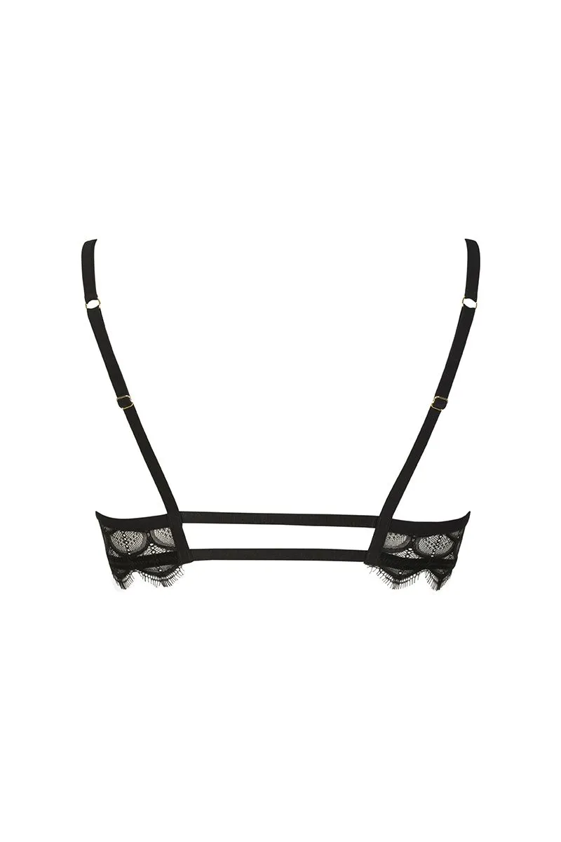 Tout en jeu de transparence, ce soutien-gorge souligne la poitrine tout en la laissant dévoilée sous une dentelle fine. Décoré d’un motif graphique fin, elle dessine sur la peau un dessin aérien. Sa dentelle à cils orne le dessus du sein. Dans un mélange de noir et d’or, ce soutien-gorge déshabille la poitrine en délicatesse.