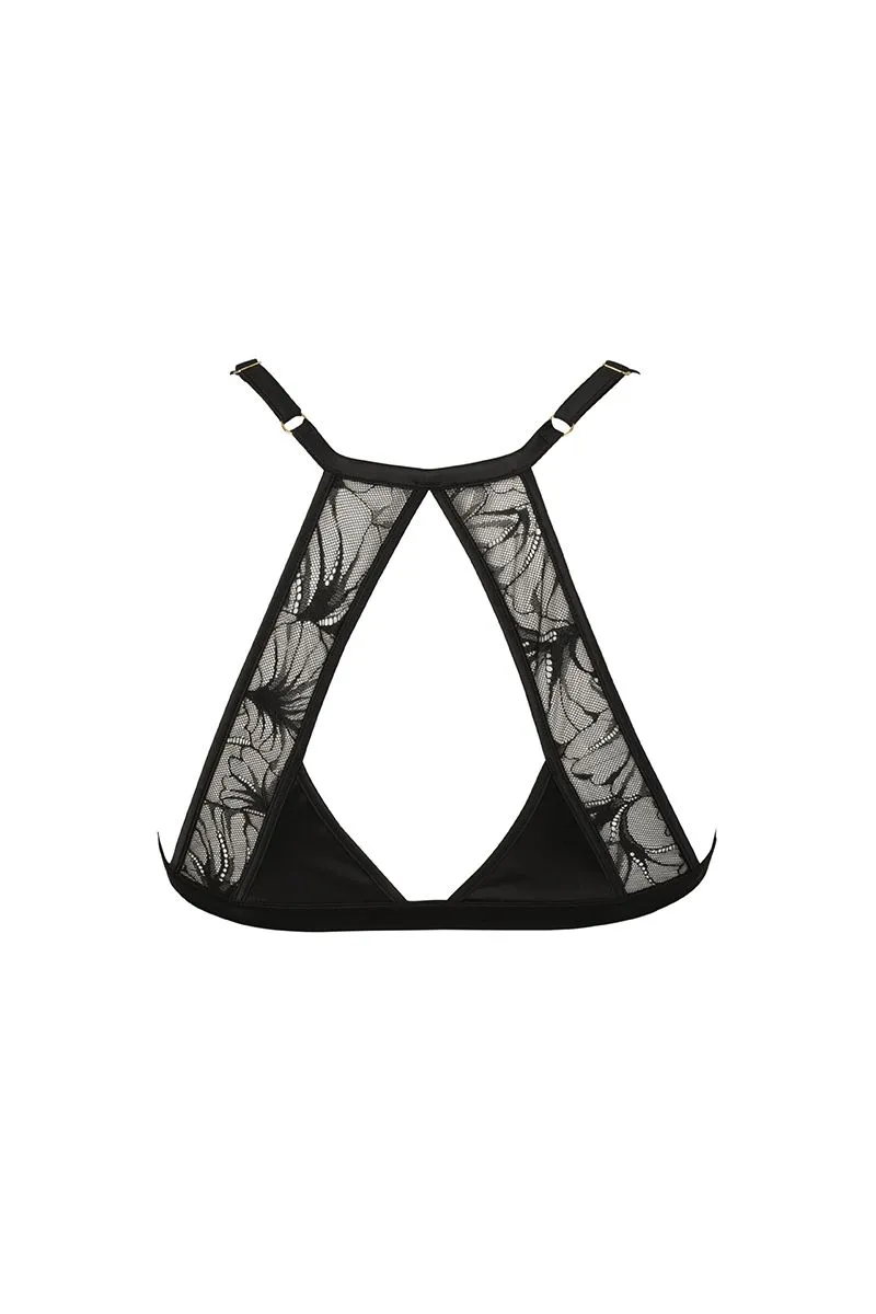 Ce soutien-gorge a une coupe triangle, sans armature, ses bonnets fins recouvrent la poitrine avec douceur. Une agrafe aimantée en acier doré permet de l’ouvrir sur l’entre-seins. Ses bretelles fines se rejoignent sur la nuque et laissent les épaules nues. Son dos est travaillé dans une coupe brassière, à la fois texturé et ajouré, qui offre un contraste sensuel entre dentelle, satin et peau nue.