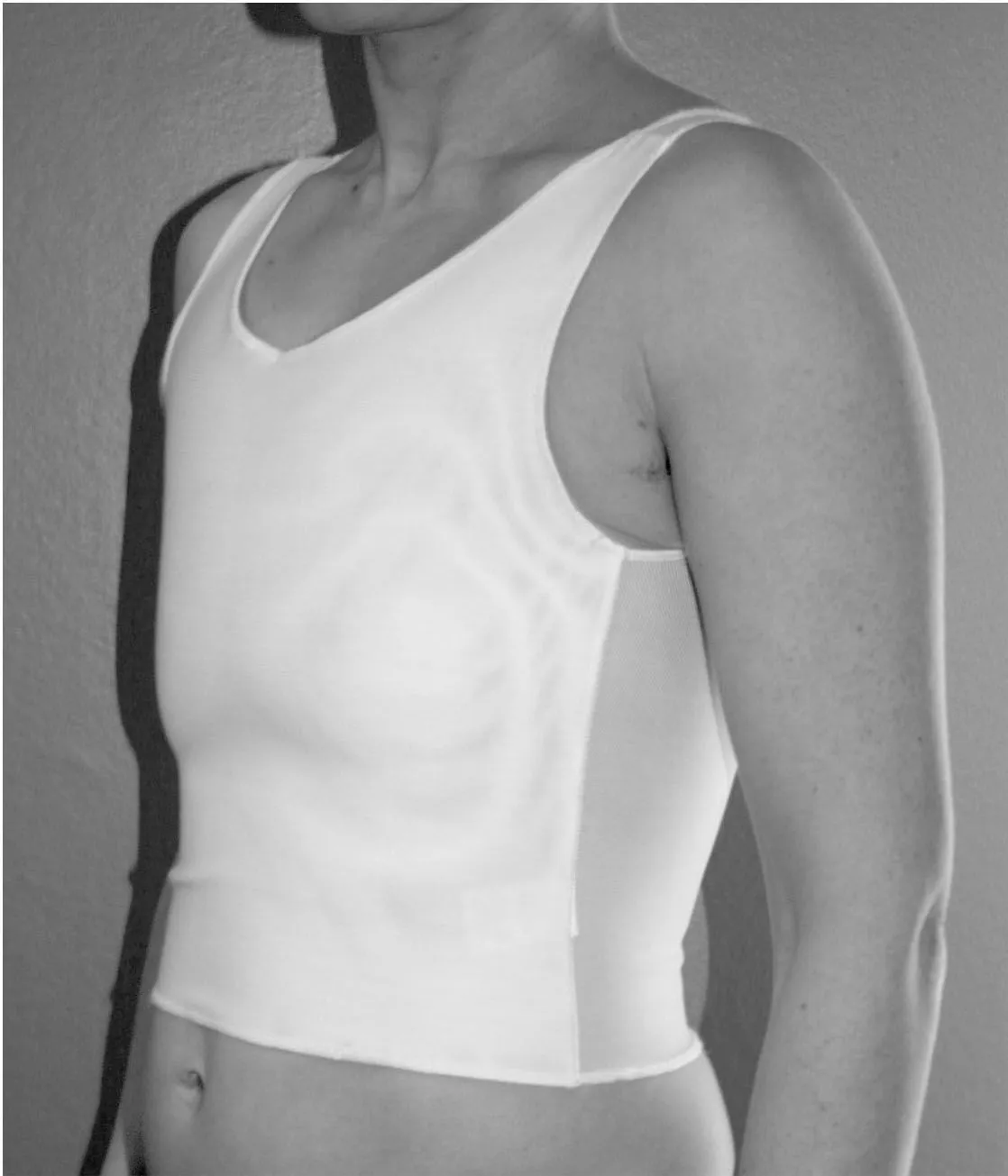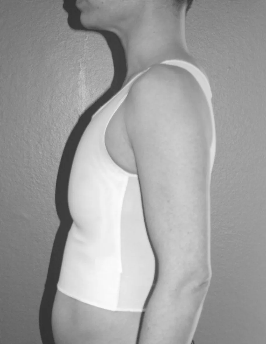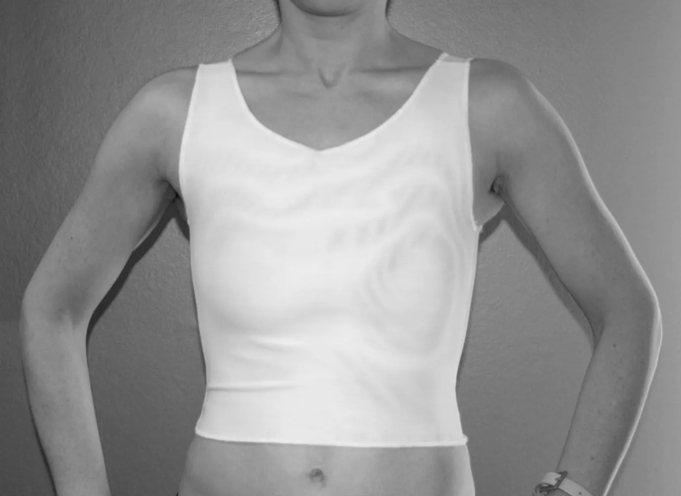 La partie de devant est renforcée par une triple épaisseur qui écrase les seins et ainsi élimine toutes “rondeurs” ou volume et donne une ligne beaucoup plus plate sur la poitrine.