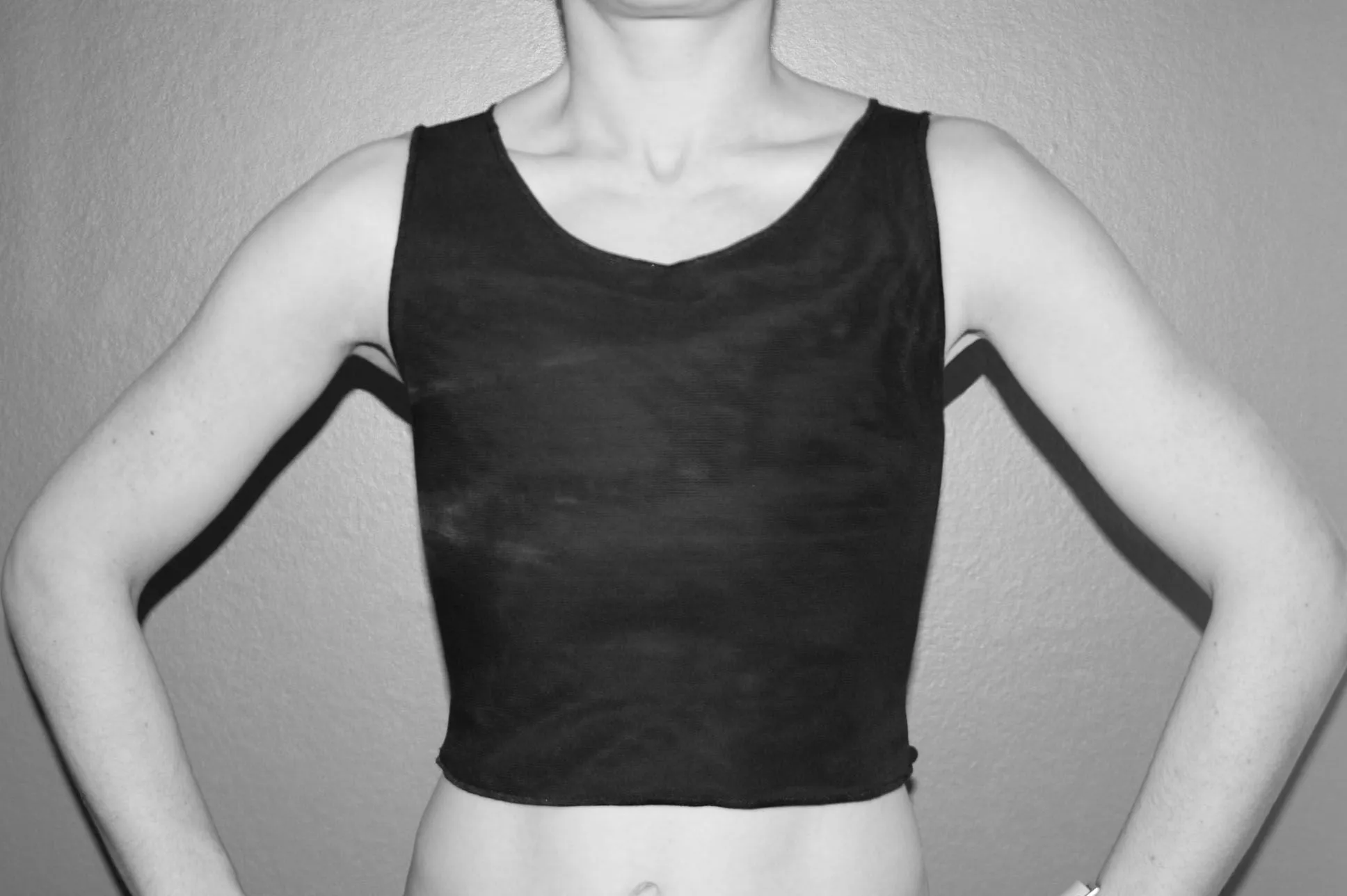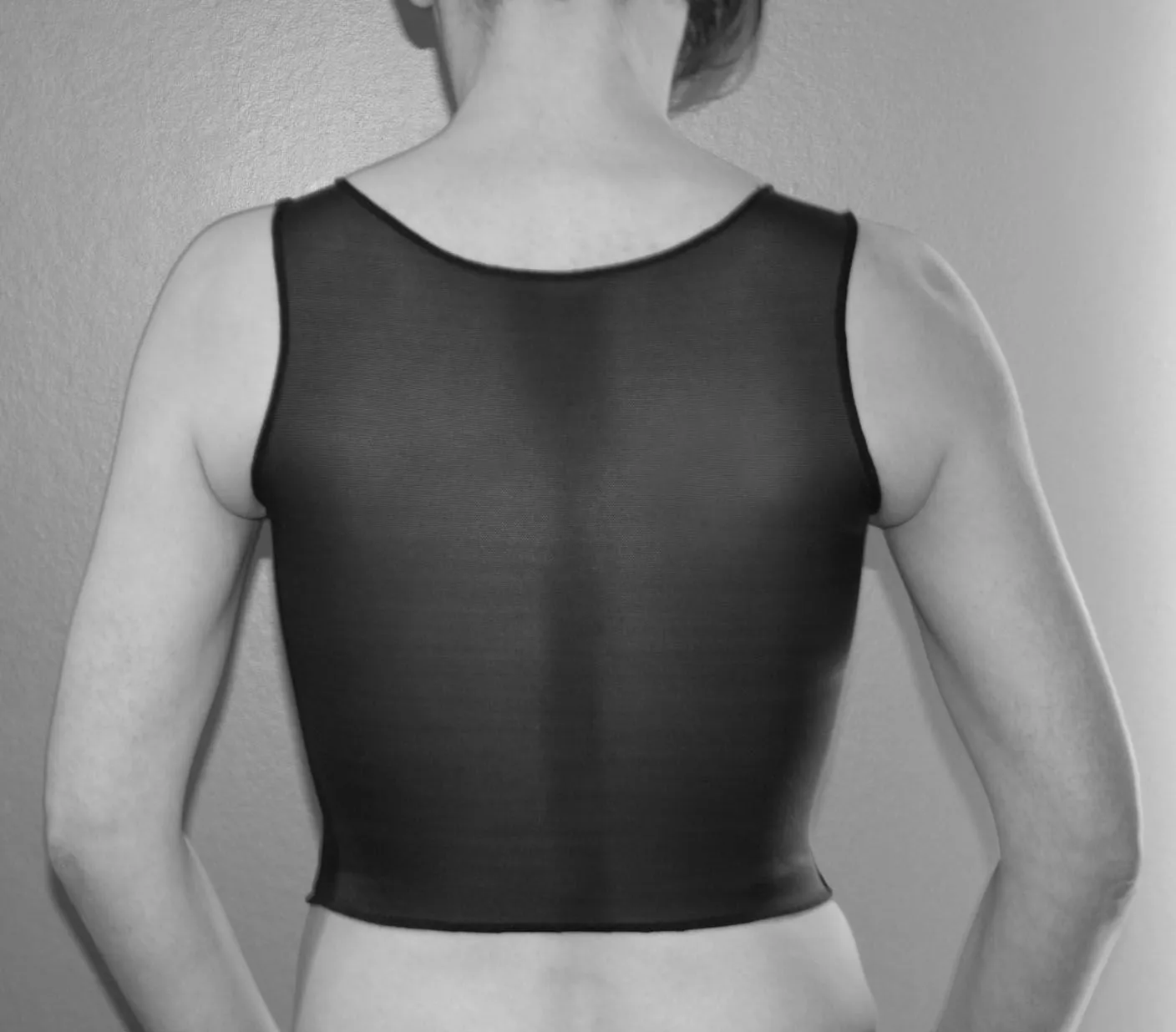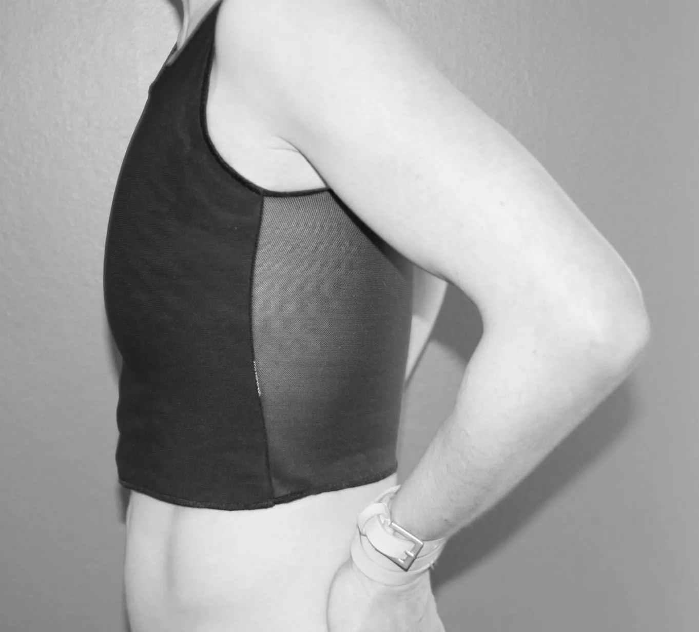 La partie de devant est renforcée par une triple épaisseur qui écrase les seins et ainsi élimine toutes “rondeurs” ou volume et donne une ligne beaucoup plus plate sur la poitrine.