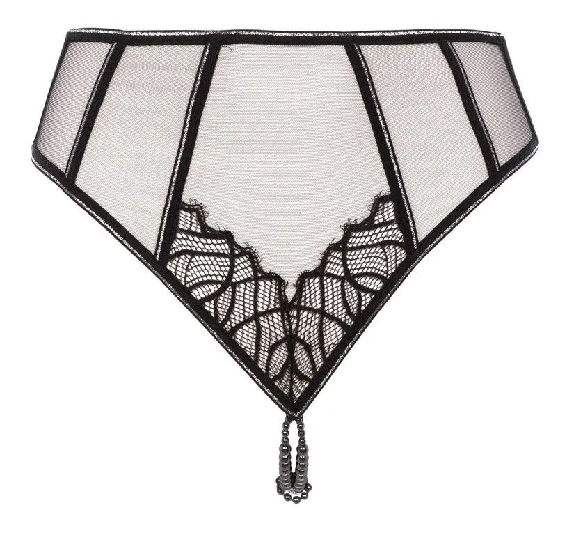 Son tulle ultra transparent habille le ventre et les hanches tandis que le pubis et le haut des fesses sont sublimés par une dentelle graphique.