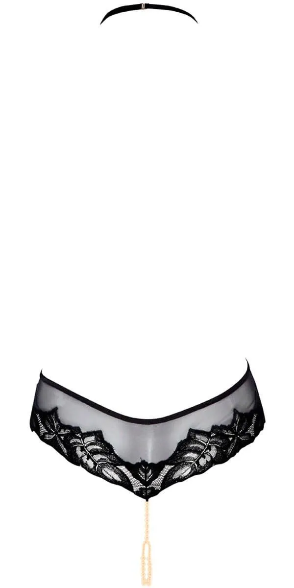 Cette playsuit est réalisée en dentelle de Calais et tulle avec des attaches en or.