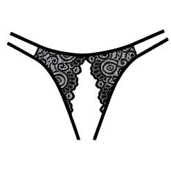Faite d’un jeu de lanière, une jolie dentelle habille l’avant et le haut des fesses.