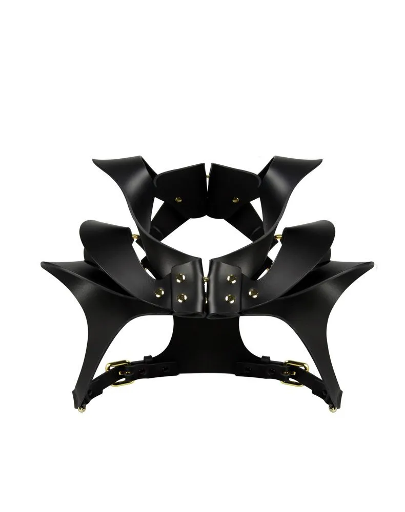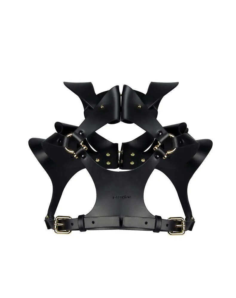 Fait à la main comme toutes les pièces de l’atelier de la créatrice londonienne, ce harnais est en cuir tannage végétal et les attaches plaquées or 24 carats.