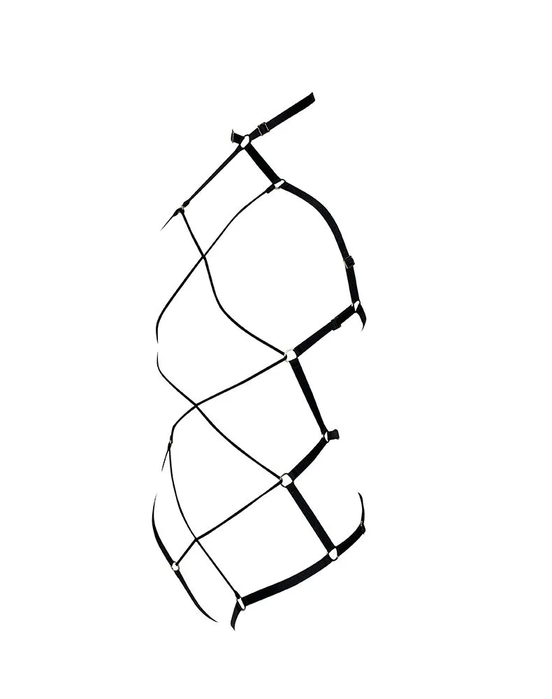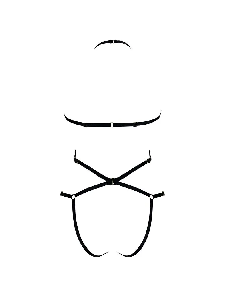 Cette playsuit se porte autant comme pièce de lingerie à part entière que comme harnais sur ou sous des vêtements. Elle s’accompagnera d’une paire de nippies et d’un string, ou sublimera un body. Cachée sous une veste ou une robe, elle invite le regard sans rien dévoiler. Ses ouvertures laissent quant à elles de nombreuses possibilités de jeu… On profite de la peau nue pour jouer avec les caresses d’une plume ou de pinces tétons. Ou on réchauffe la peau nue avec une huile chauffante.