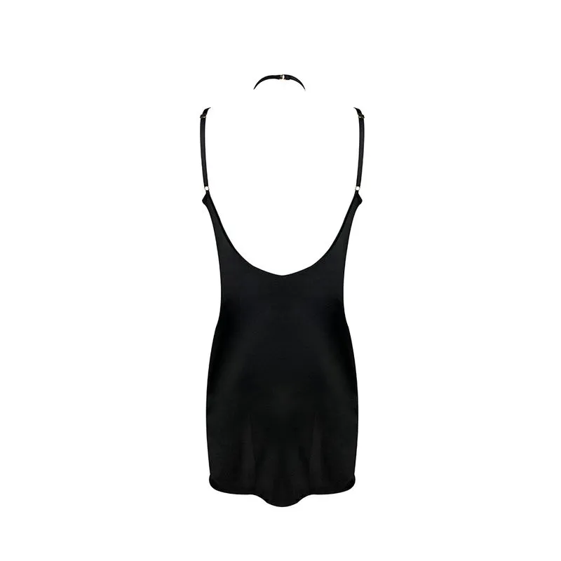 Cette robe souligne la poitrine avec son col bénitier qui met en valeur le décolleté. Ses bretelles fines et son dos échancré laissent les épaules nues. Ni trop longue, ni trop courte, elle souligne la taille et allonge la jambe. Le cou est habillé d’un fin harnais en lanières élastiques ornées d’attaches plaquées or. Son harnais sublime la peau et apporte une touche provocante à cette robe très sensuelle.