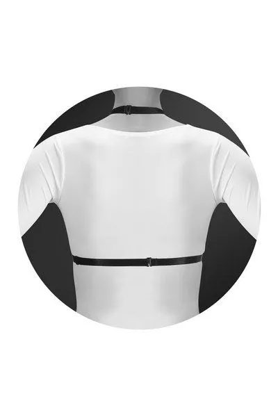 Le harnais de poitrine Clara attire le regard et met la poitrine en valeur. Composé de douces lanières satinées noires et d’un anneau en acier argenté, cette pièce de lingerie est aussi fonctionnelle qu’originale. Les lanières sont ajustables afin de s’adapter aux différentes tailles de tour de seins. Confortable et esthétique, ce harnais habille la nudité avec des lanières de différentes largeurs pour un effet déstructuré qui embellit les tenues.