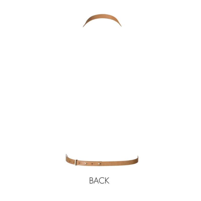 En cuir vegan certifié PETA sa couleur camel viendra adoucir le côté bondage du harnais et sera une couleur parfaite pour le printems et l’été.
