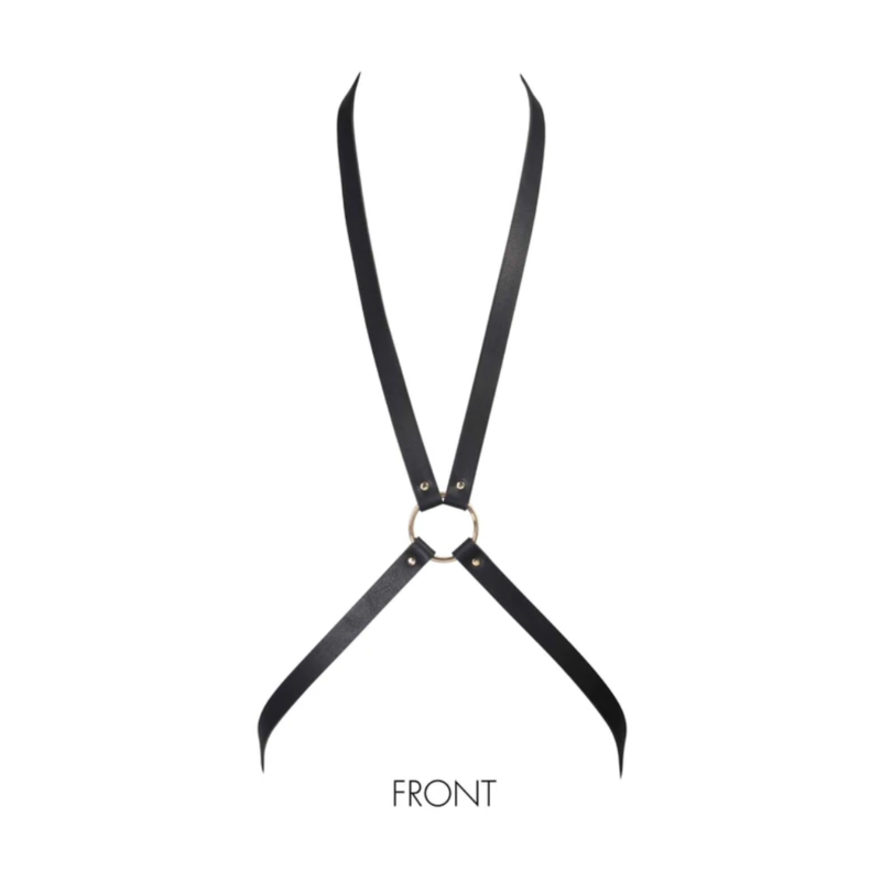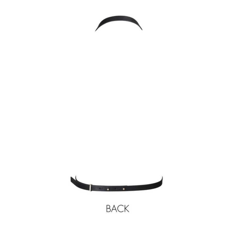 En cuir vegan certifié PETA ses fines lanières et ses acccroches dorées viendront adoucir le côté bondage du harnais.