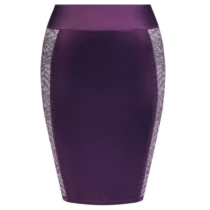 Savant mélange de satin et de dentelle florale, cette jupe habille la peau avec délicatesse. Ses matières douces et non élastiques sont faites pour sublimer les courbes. Sa dentelle fine habille les cuisses et les hanches d’un motif fleuri. D’une couleur violet foncé, elle se marie aisément avec vos parures de lingerie ou tenues du quotidien.