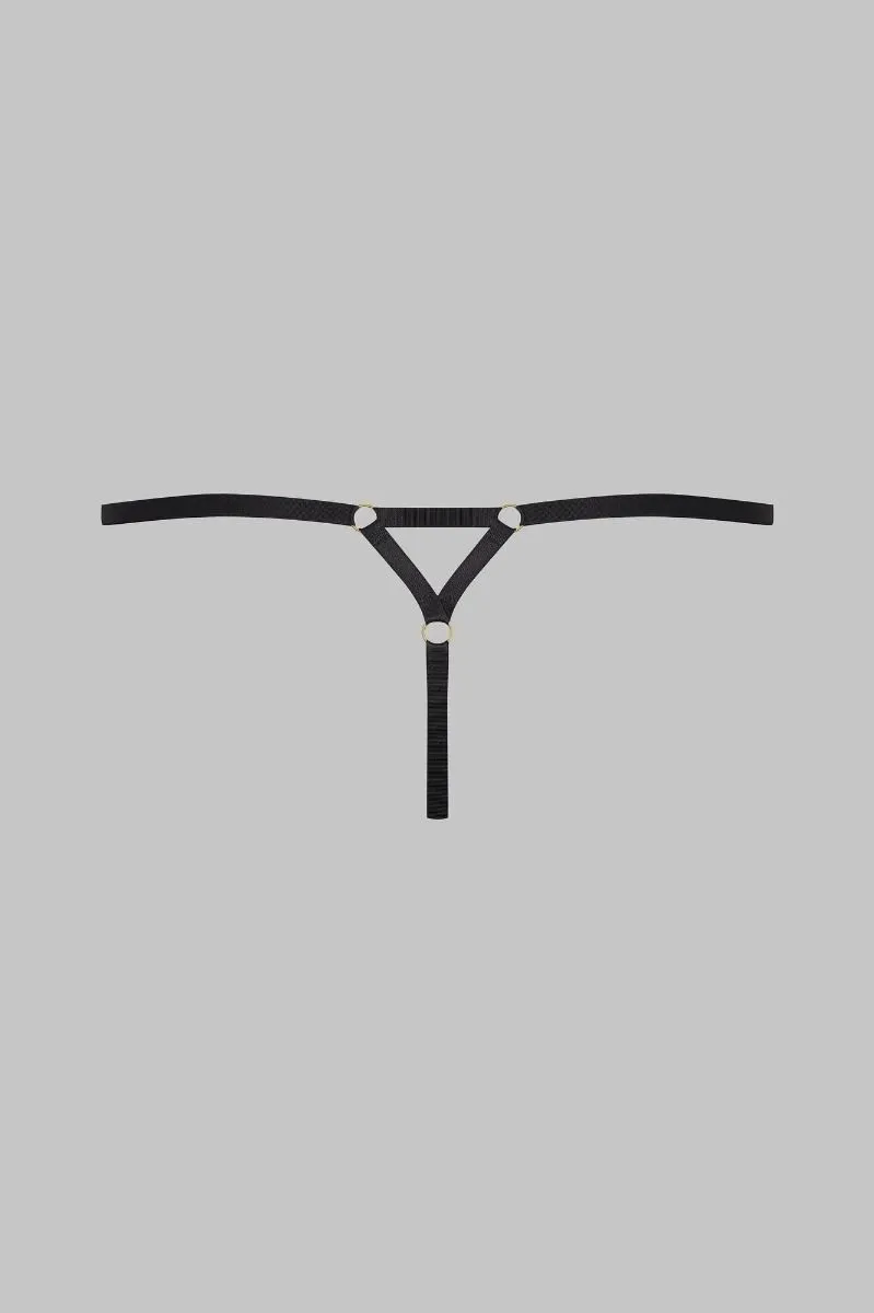 Pièce passe partout de la collection, ce mini string se porte avec chacune des autres pièces. Ainsi, on le glissera sous la robe ouvrable ou le serre-taille, ou on l’associera au soutien-gorge seins nus. Ses lanières fines disparaissent aisément sous les vêtements. Tout en noir et or, ce string se marie facilement à d’autres pièces de lingerie. Pour une parure minimaliste, on le portera simplement avec une paire de nippies et un kimono, ou bien, on le glissera sous une robe transparente laissant apparaître ses attaches comme des bijoux.