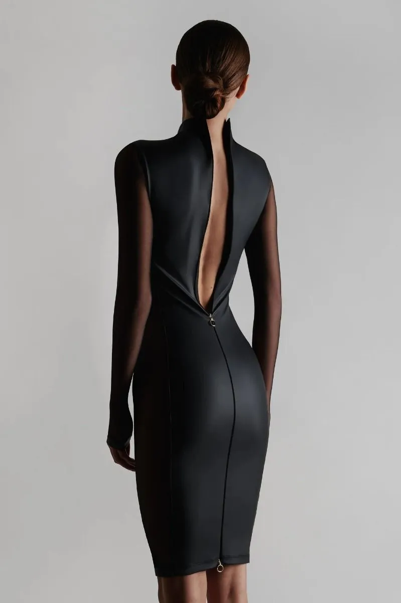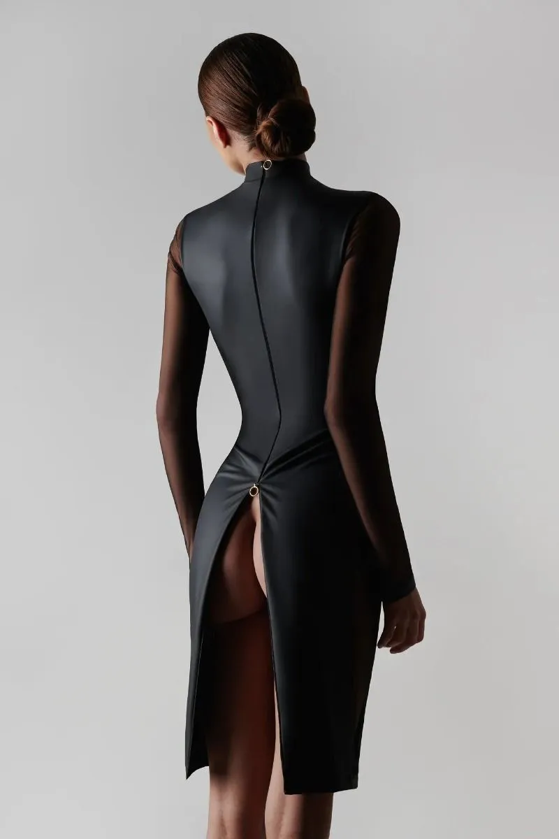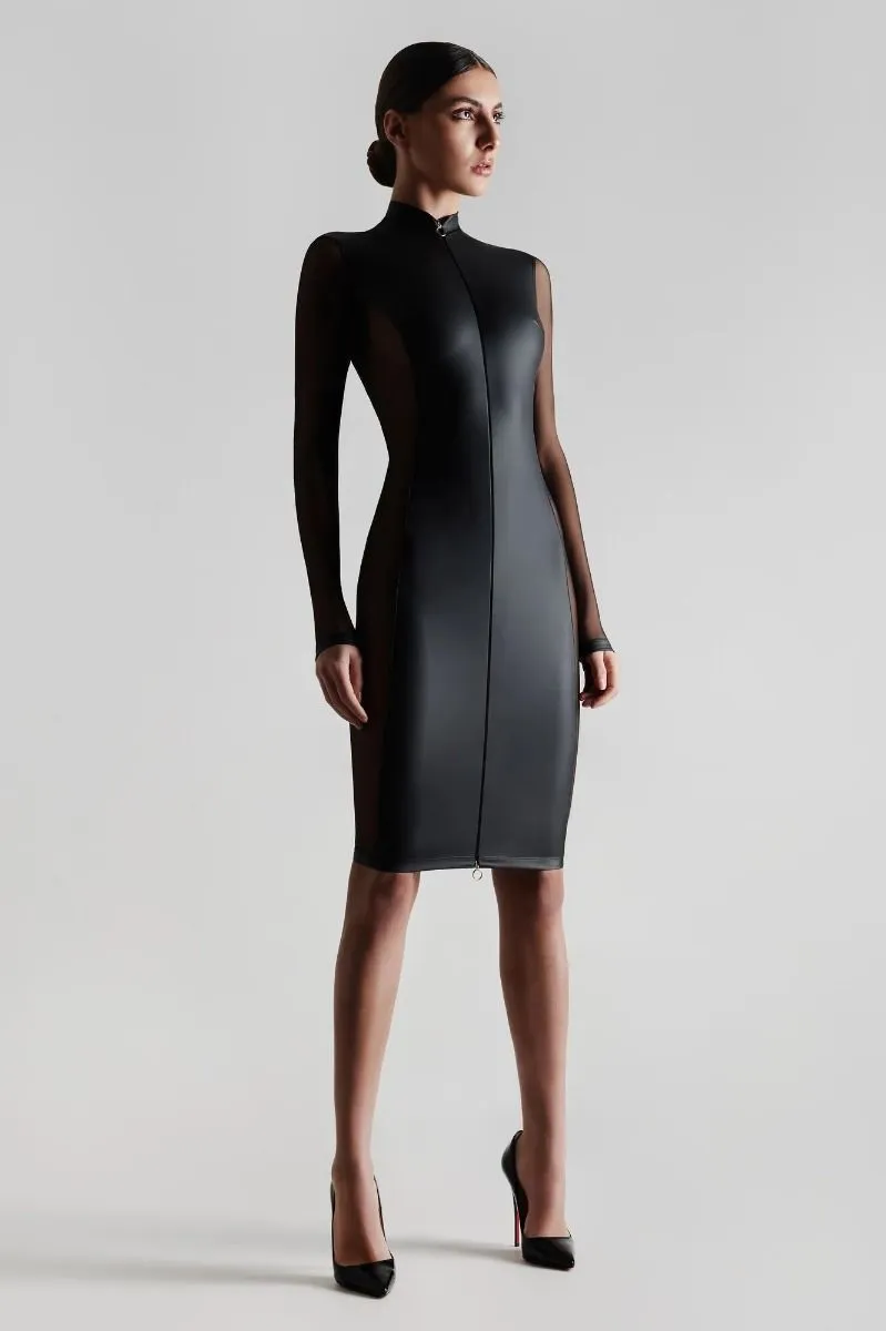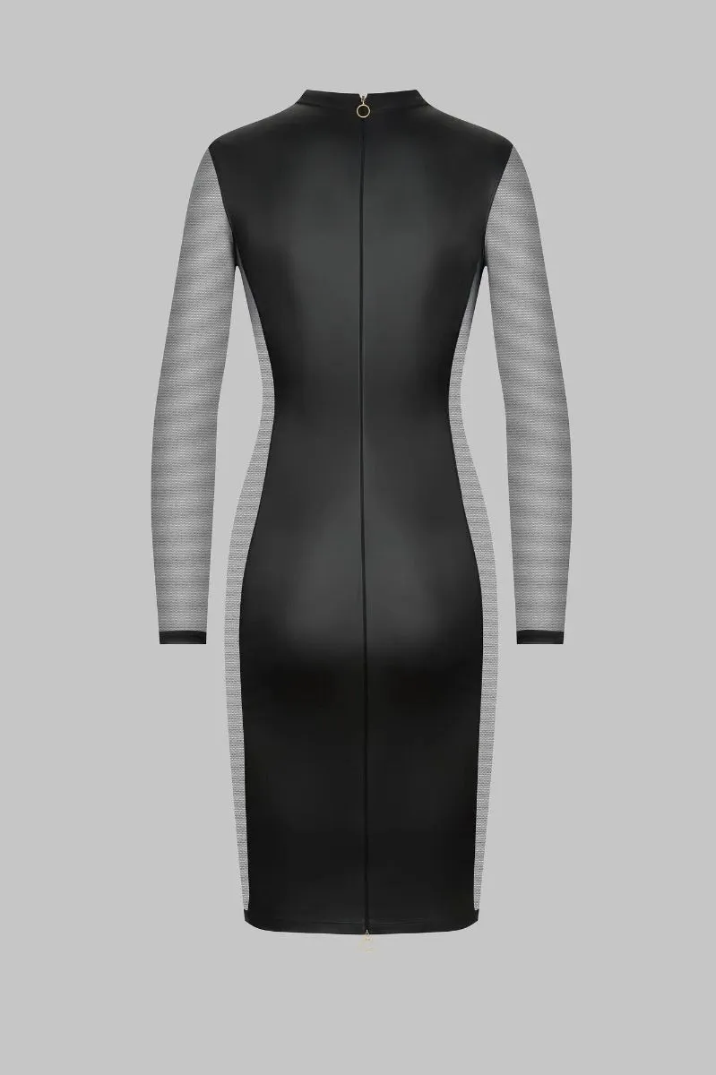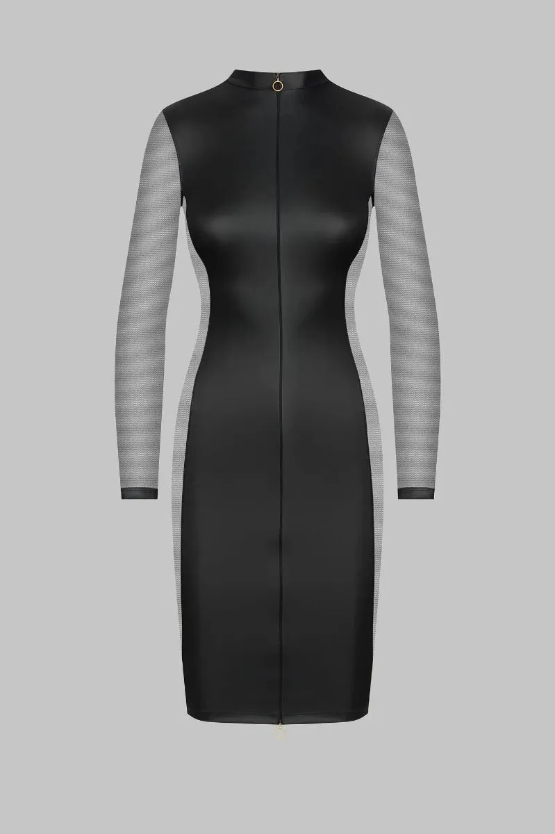 Avec sa jupe crayon et ses manches longues, cette robe couvre en grande partie la peau. Sa coupe ajustée souligne la taille. Deux empiècements de tulle ultra transparent laissent la peau découverte sur les côtes et les hanches. Son tissu effet cuir ultra doux, bien qu’opaque, souligne avec légèreté les courbes. Deux fermetures éclairs ornent la robe, une sur l’avant, une sur le dos. Chacun est dotée de deux curseurs, les rendant ouvrables dans les deux sens. A vous d’en choisir l’indécence de l’ouverture…