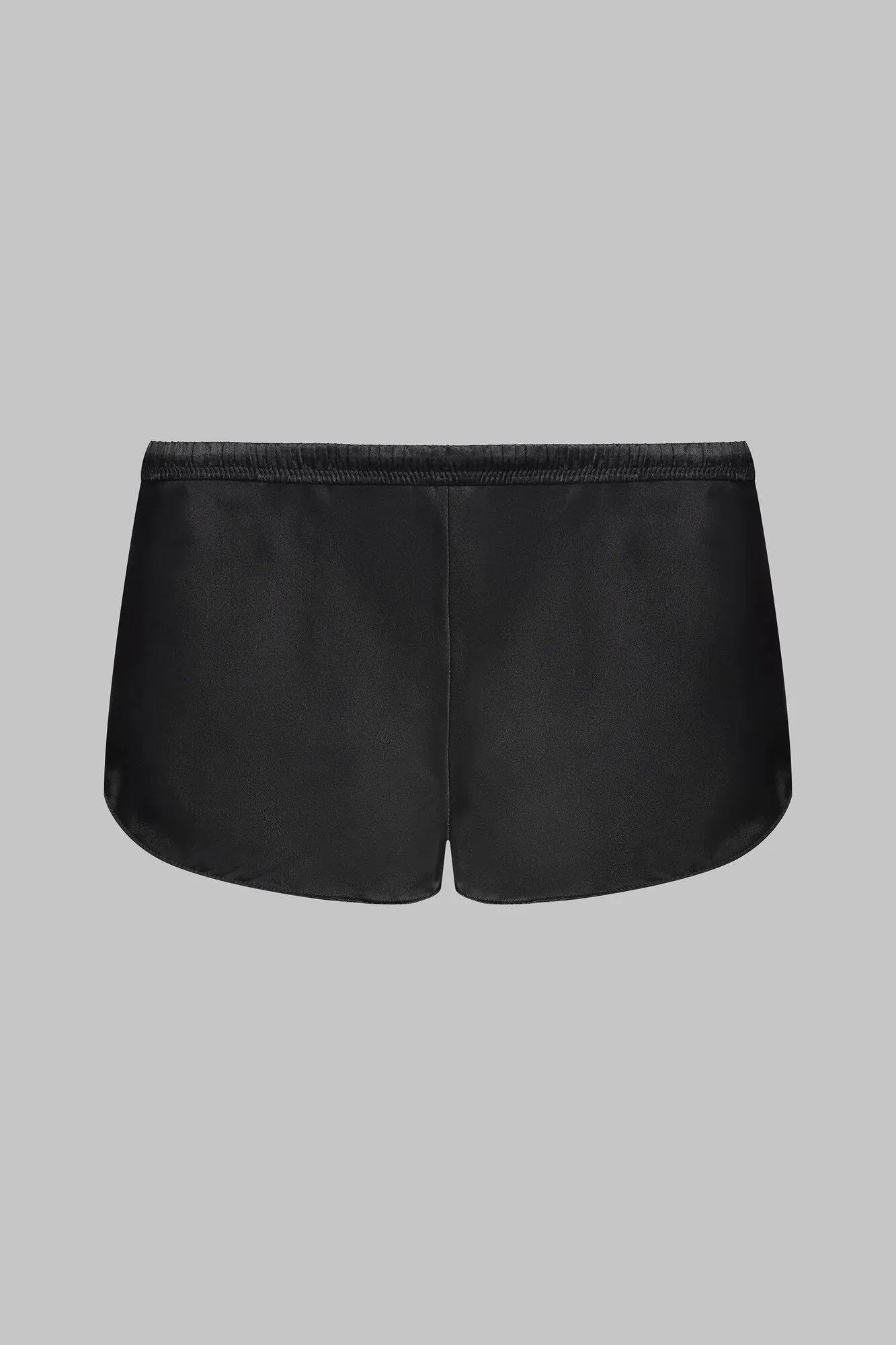 Taille basse, ce mini short habille les hanches et les fesses d’une soie fine. Deux fentes arrondies de chaque côté subliment la silhouette. Sa ceinture élastique est recouverte de soie froncée, elle assure son maintien tout en confort. Sa coupe échancrée sur le dos souligne le galbe naturel de la fesse.