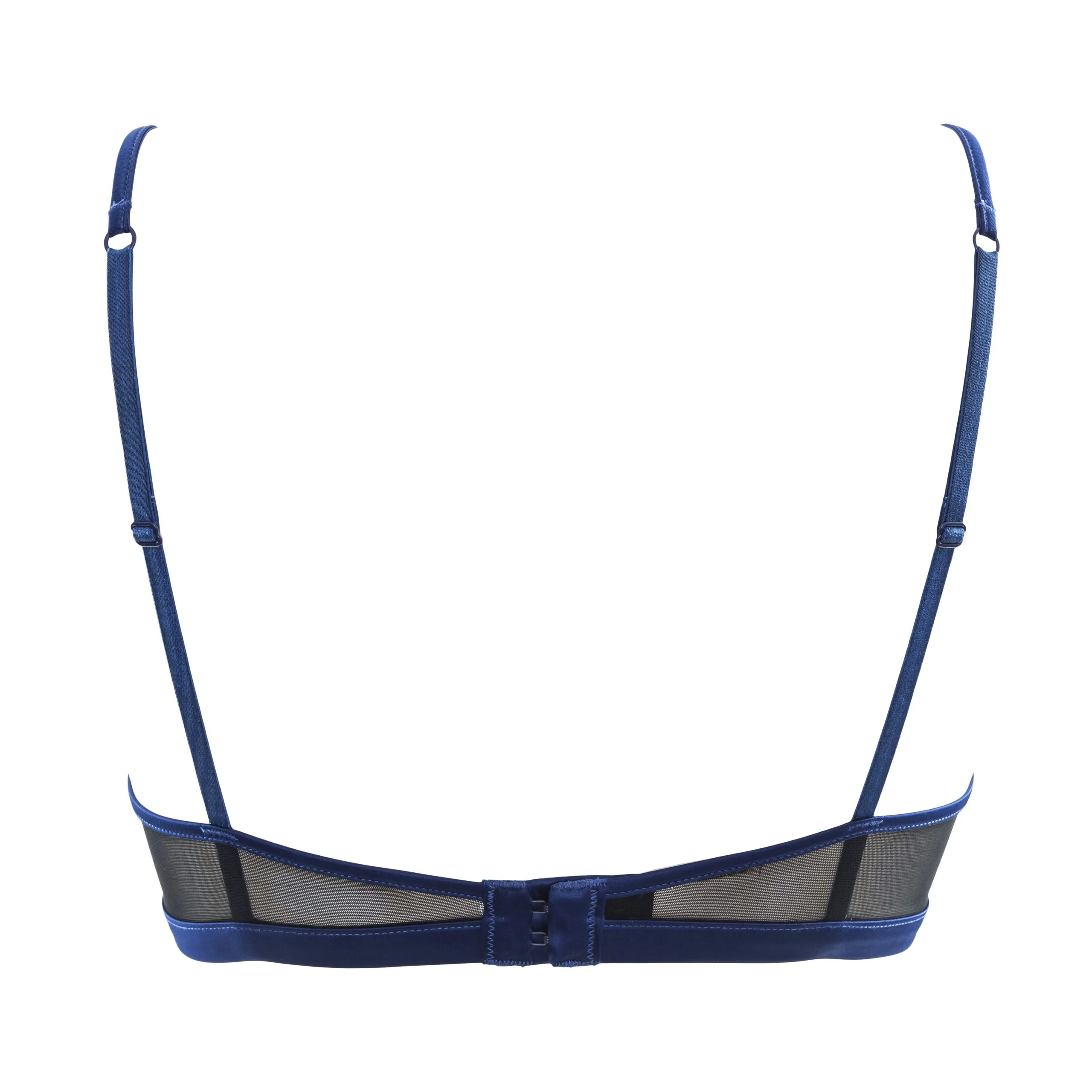 Contraste subtil entre le noir de la dentelle et du tulle et le bleu marine du satin mat pour cette collection tout en subtilité.