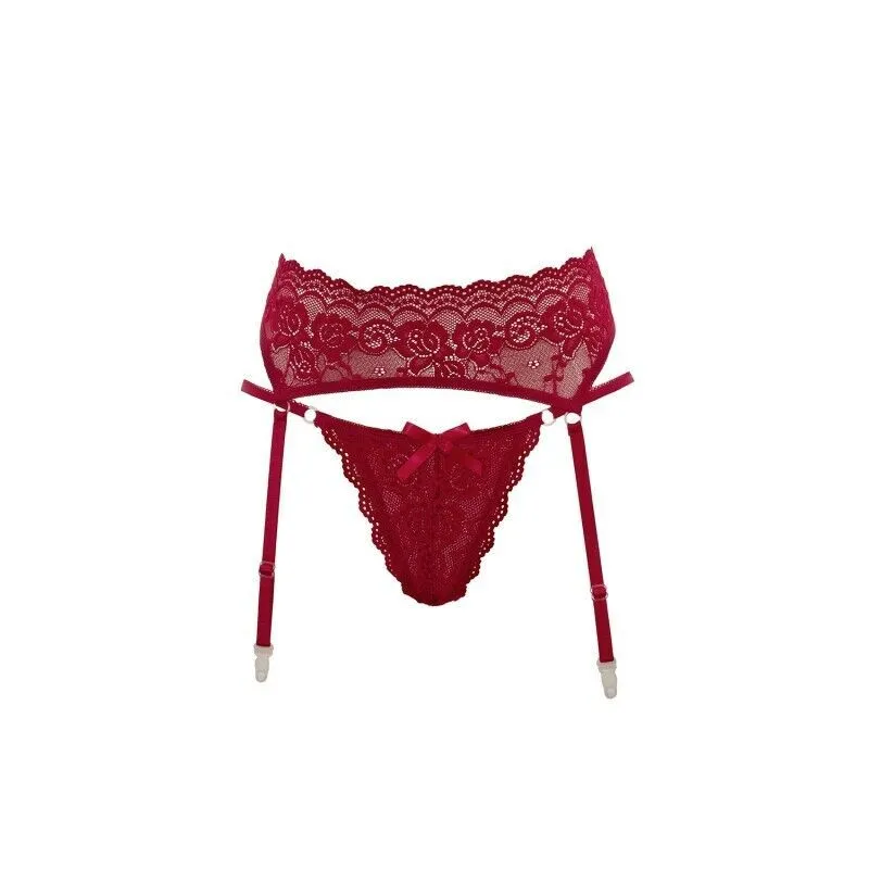 Ce porte-jarretelles est en dentelle fine qui dessine un motif floral sur les hanches. On le portera en parure avec un ensemble de lingerie en dentelle ou un harnais de poitrine et une paire de nippies. Ses attaches permettent de le porter avec tous les bas en voile.