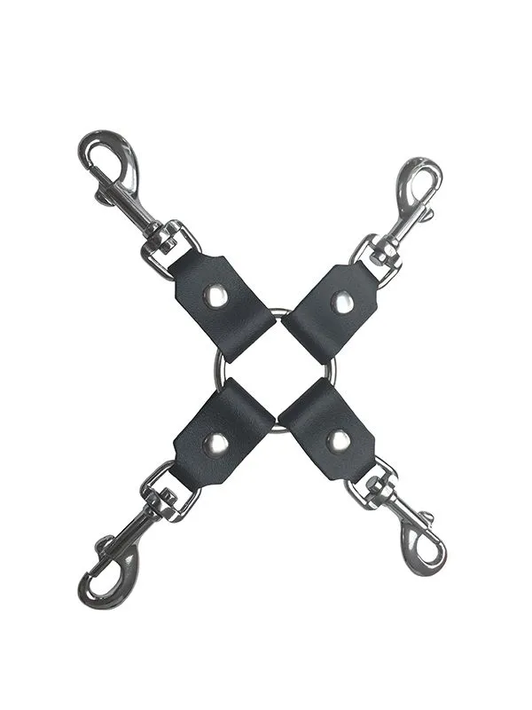 Cette attache en croix est composée de 4 lanières reliées par un anneau en acier et qui se terminent chacune par un mousqueton en acier argenté. Elle peut être utilisée pour relier différents accessoires entre eux. Ainsi, on l’accrochera à une paire de menottes et de chevillères ou bien à un collier et une ceinture de contrainte.