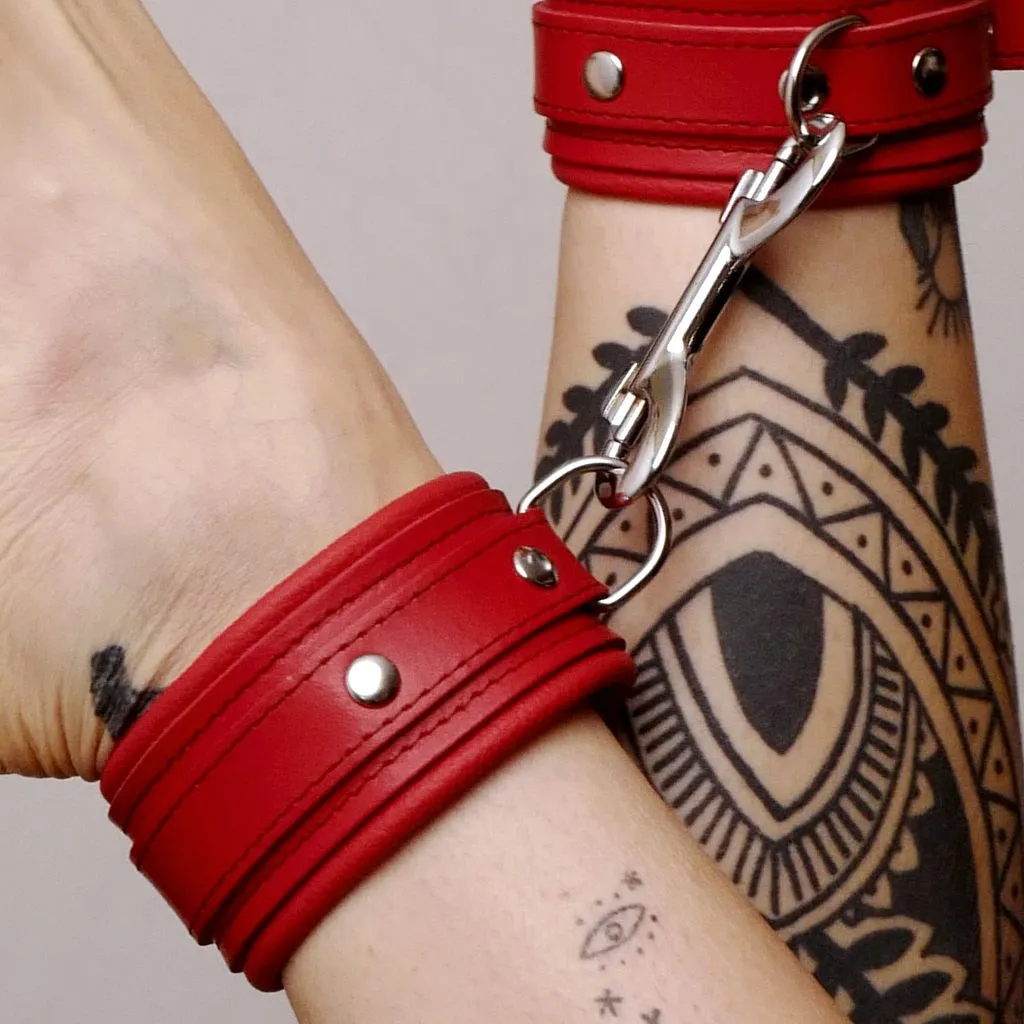 Ces chevillères en cuir rouge sont reliées entre elles par un mousqueton en acier amovible. Il peut facilement être remplacé par un autre accessoire comme une corde en chanvre ou en coton, un lien en soie ou une laisse pour laisser libre cours aux jeux de soumission. Créez votre kit complet en l’associant au choker et aux menottes de la même collection. Et cela ne s’arrête pas là! Les possibilités sont infinies et pour varier les jeux de soumission, d’autres accessoires sont à disposition comme une ceinture de cuisses, des anneaux de suspension, des bougies à basses températures, etc. La voie du plaisir est infinie !